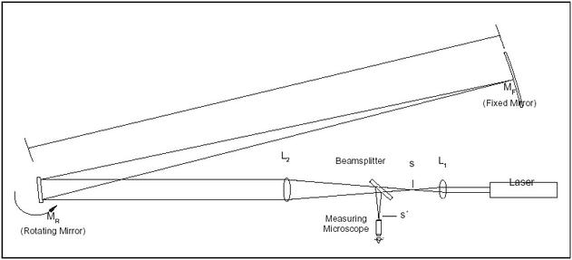 Abstract: A helium neon laser was setup on an optics bench approximately one meter in length. When turned on, the laser beam passes through two lenses designed to achieve the desired beam width. At the end of the optics bench, opposite of the laser, a rotating mirror was placed to reflect the beam to a stationary mirror 11.5 meters away. The stationary mirror serves and a retroreflector, sending the beam back along its original path, striking the rotating mirror a second time. As the beam travels back towards the laser source, a beam splitter is placed in its path to send the light into an eyepiece where an image point can be observed, and its location is recorded. When the rotational velocity of the mirror is increased, a deflection of the image point takes place and this deviation is record. The deflection, along with rotational speed of the mirror and some distance measurements, can be used to calculate the speed of light. The experiment yielded a value for c of 3.0 E8 ± 2.7 E6 m/s, which agrees with the accepted value of 2.99×10^8 m/s. The results of the experiment could be improved by using a more accurate tool to measure the distance between the rotating and fixed mirror, and by taking more than one data set.