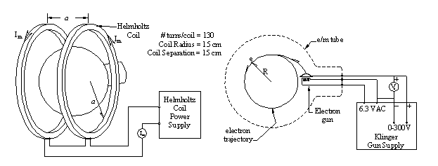 Abstract: An e/m apparatus was used to formulate a simple method for measuring e/m, the charge-to-mass ratio of the electron. Using a e/m tube filled with helium, Helmholtz Coils, a mirrored scale and power supply; radius data, voltage data, and current data were collected and plotted on a non-linear plot. Utilizing the relationship between the Lorentz force and Centripetal force, a model was derived for the motion of electrons in the e/m apparatus that was used to linearize the data. The linearized plot yielded a value for e/m of 2×10^11 .1×10^11 C/kg, which agrees with the accepted value of 1.758×10^11 C/kg. The results of this experiment could be improved by having several different people take measurements for radius and computing an average, and by restricting measurements to larger circles, where the observer could more easily take radius measurements.